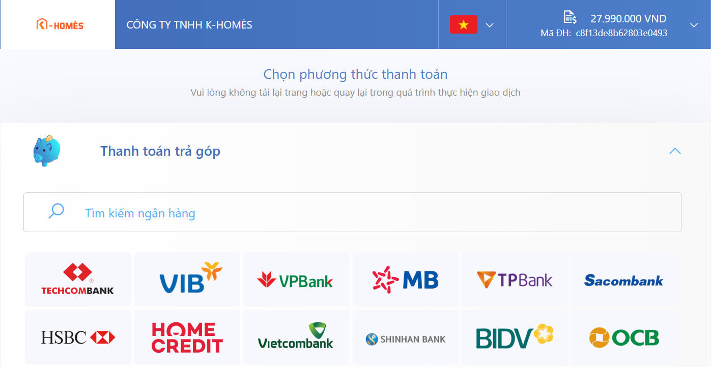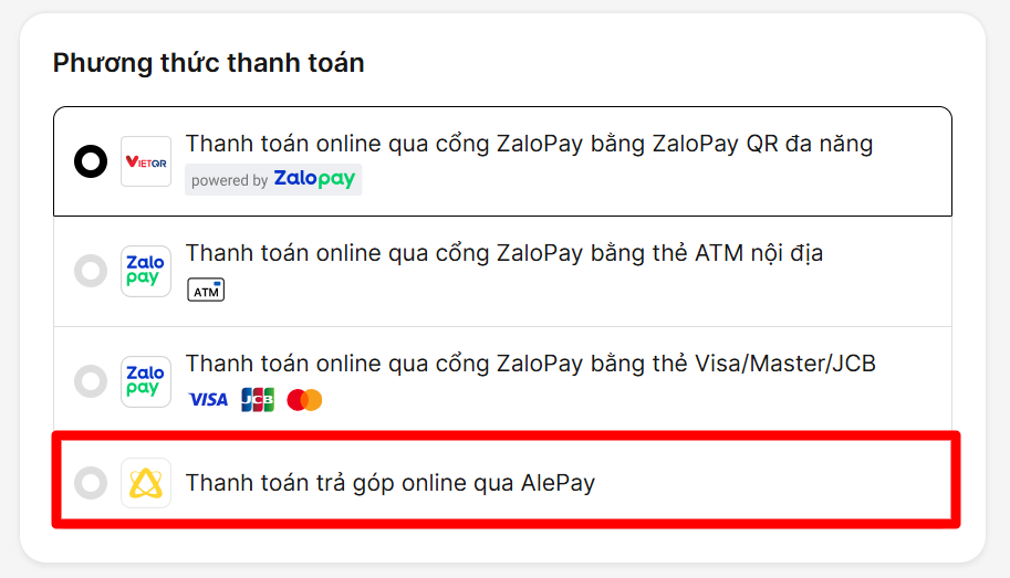 Bước 2: Sau khi chọn phương thức thanh toán Alepay (Trả góp lãi suất 0%) và xác nhận đơn hàng. Quý khách hàng sẽ được chuyển đến trang thanh toán AlePay.