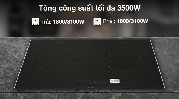 Bếp từ Bosch sở hữu tổng công suất nấu lên đến 3500W, giúp nấu ăn nhanh chóng, tiết kiệm thời gian.