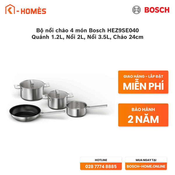 Bộ nồi chảo 4 món Bosch HEZ9SE040 - Quánh 1.2L, Nồi 2L, Nồi 3.5L, Chảo 24cm