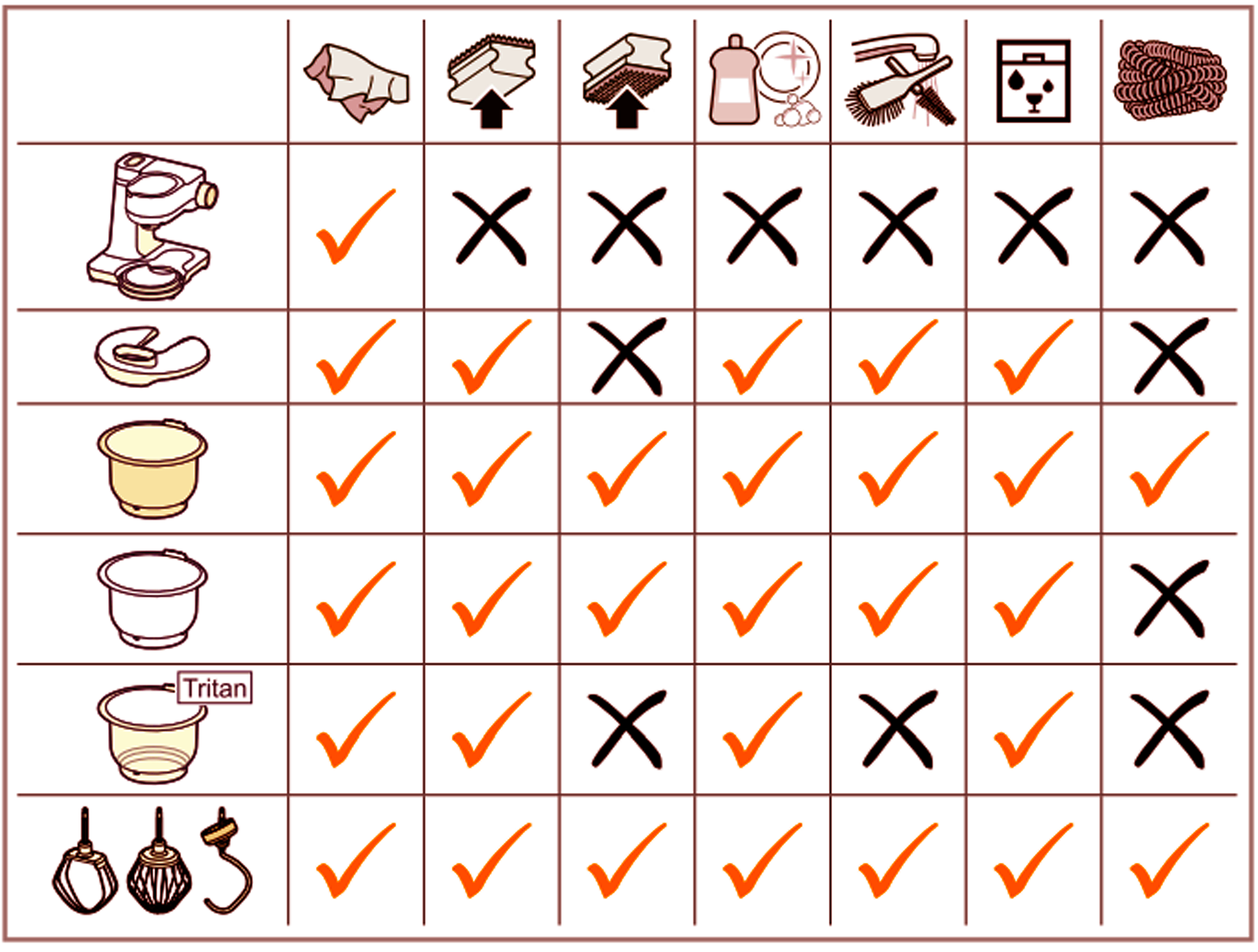 - Bộ phận cắt/thái/bào, dao đa năng, móc nhào bột, phới đánh kem