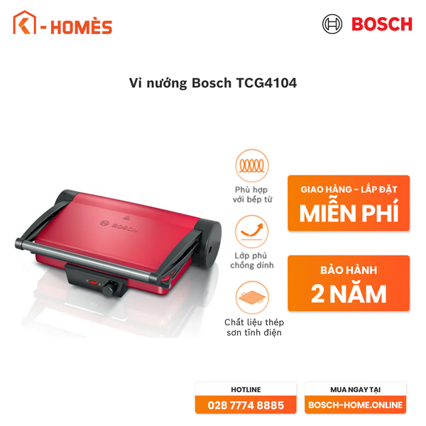 Máy nướng bánh mì/ Vỉ nướng Bosch TCG4104 sở hữu thiết kế hiện đại, nhỏ gọn với màu đen – đỏ cá tính, tạo điểm nhấn sang trọng cho gian bếp. Thân máy bằng thép sơn tĩnh điện giúp tăng độ bền, chống rỉ sét và chịu nhiệt tốt. Máy tích hợp nhiều chức năng tiện lợi như nướng bánh mì kẹp, pizza, thịt, rau củ, đồ BBQ và hâm nóng thực phẩm, đáp ứng đa dạng nhu cầu nấu nướng.